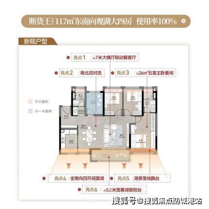 117㎡的四房则更适合多口之家。横厅达到约7.3米宽,南向大面宽带来超强采光,公共区域可以打通成一个大尺度空间。主卧套房约26㎡,带落地飘窗、独立衣帽间和化妆区,私密感很强。次卧采用非剪力墙结构,未来根据家庭需求改造起来也很灵活。整体得房率接近100%,方正对流,通风和视野都处理得不错。东南向观湖的户型数量不多,尤其是最后一栋楼的这些产品,成了很多人眼里的“限量藏品”。