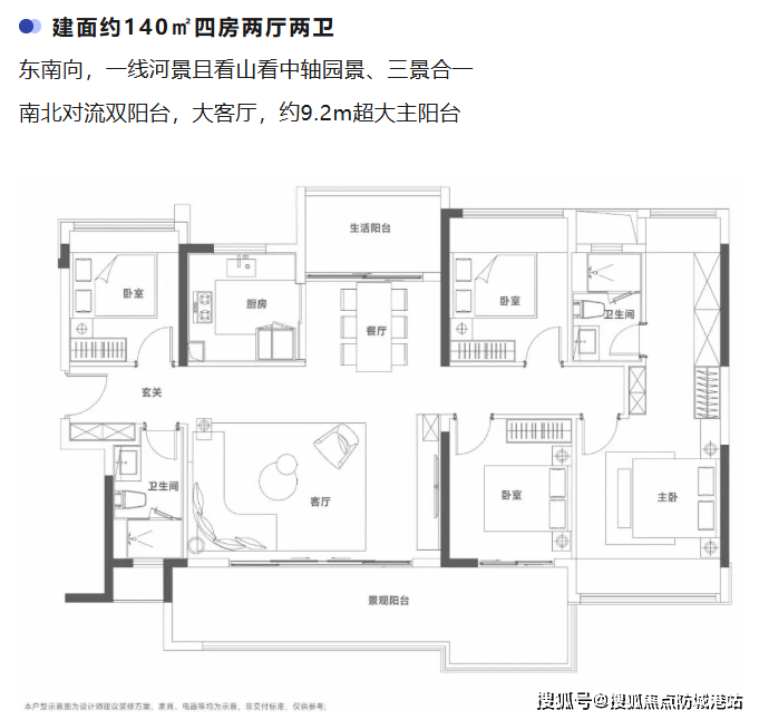 多功能分区:以建面约140㎡的四房户型为例,其主阳台宽度达9.2米,南北对流双阳台设计。南向大阳台可欣赏河景与山景,北向小阳台则可作为洗衣晾晒区或家政操作间,实现了动静分离、干湿分区。这种设计不仅提升了空间利用率,更保证了生活的私密性与便利性。