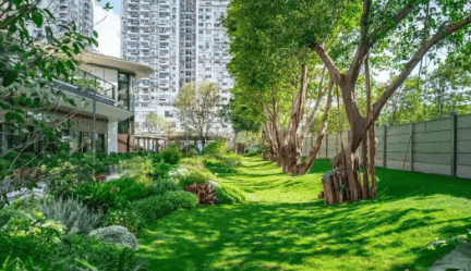小区虽然只有3栋楼,但园林设计下了功夫。我看到的部分示范区已经复刻了余荫山房的岭南庭院风格,洗钵池水景、竹林小径、遮阳廊架一应俱全。特别注意到,园子里种了不少驱蚊植物,甚至辟出一块药圃,种着薄荷、艾草这类煲汤常用食材——以后街坊下楼摘点料就能开火,很“老广”。中央草坪约2000㎡,配有休憩座椅和儿童活动区,日常遛娃或晨练完全够用。