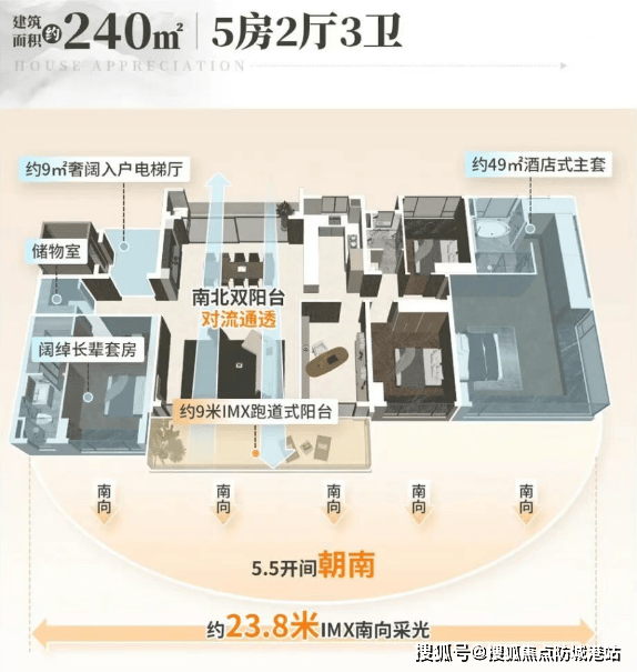 以备受关注的T7栋为例,该楼栋主打建面约140平方米的四房户型,采用了纯南向板楼设计,确保了每一户的通风与采光效果。该户型设计了约8.4米的南向巨幕阳台,结合270°的飘窗,最大化地将中央园林景观与远处的白云山景引入室内。客厅区域采用LDKG(客餐厨阳)一体化设计,面积约34平方米,足以容纳8人餐桌,满足多代同堂家庭的聚会需求。双套房布局是另一大亮点,两个卧室均配备独立卫生间且朝南,既保证了主人的私密性,也方便长辈居住。对于追求极致空间的改善型客户,T5栋提供的建面约240平方米大平层则展示了更高的居住标准,专梯专户的设计配合约9平方米的入户电梯厅,赋予了住户独立的玄关缓冲空间。这些户型设计并非单纯追求房间数量,而是通过对过道、墙体等非使用面积的压缩,以及对阳台、飘窗等赠送空间的利用,实现了空间效能的最大化。