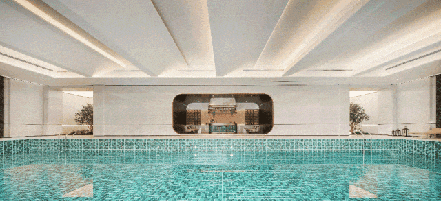 这座会所不仅仅是物理空间的堆砌,更是生活方式的载体。内部随处可见意大利威尼斯棕、云南香格里拉翡翠、巴西百达斐绿等奢石,营造出类似艺术展馆的视觉效果。功能设置上,会所包含了阳光运动场、健身房、瑜伽室、室内恒温泳池以及私宴厅五大核心场域。特别值得一提的是室内恒温泳池,它克服了传统室外泳池受季节限制的弊端,确保业主在冬季也能进行游泳锻炼,泳池旁还设有行政酒吧,供业主在运动后放松交流。除了集中式会所,项目还利用架空层打造了22个主题的无界泛会所。例如在T5栋楼下设置的“总裁会客厅”,配备了吧台与私密会客区,方便业主处理商务事宜或进行社交活动;针对女性业主的休闲区可提供下午茶与美甲服务;而茶室则为长辈提供了切磋棋艺、以茶会友的空间。这些分散在社区各处的功能节点,将服务延伸到了业主的日常生活半径内。