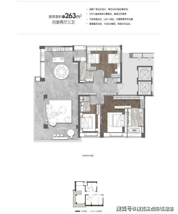 主力产品涵盖217–263㎡江幕大平层,专梯专户设计,私密性极佳。【揽江】217㎡户型实现三开间朝南、南北双阳台对流,主卧配独立衣帽间与双台盆卫浴;【御江】263㎡则以超17米L型转角阳台、270°落地玻璃幕墙,将桂畔海江景最大化引入室内,LDKB一体化空间搭配西式岛台,营造国际奢居氛围。全系户型强调景观视野、功能分区与空间尺度,在顺德主城滨江住宅中树立了“江景+奢装+纯粹圈层”的新标杆,重新定义了千万级改善住宅的价值逻辑。