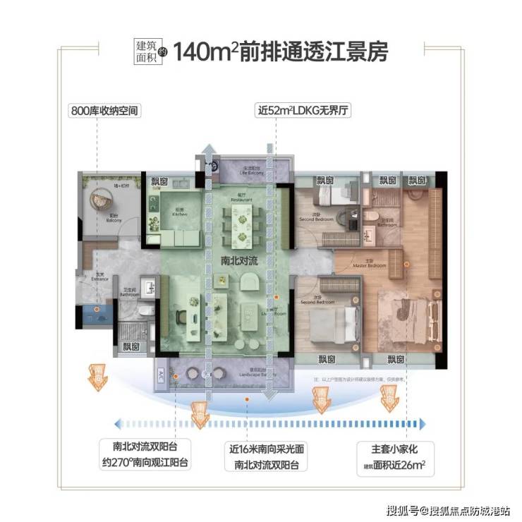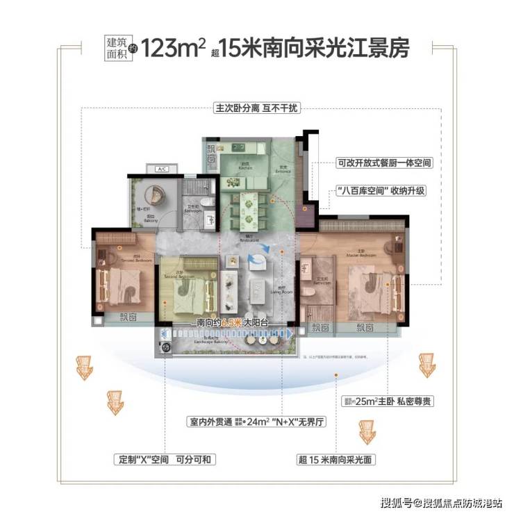 户型亮点:南向望江、南北通透、双阳台设计、超宽楼间距、高得房率约 95%