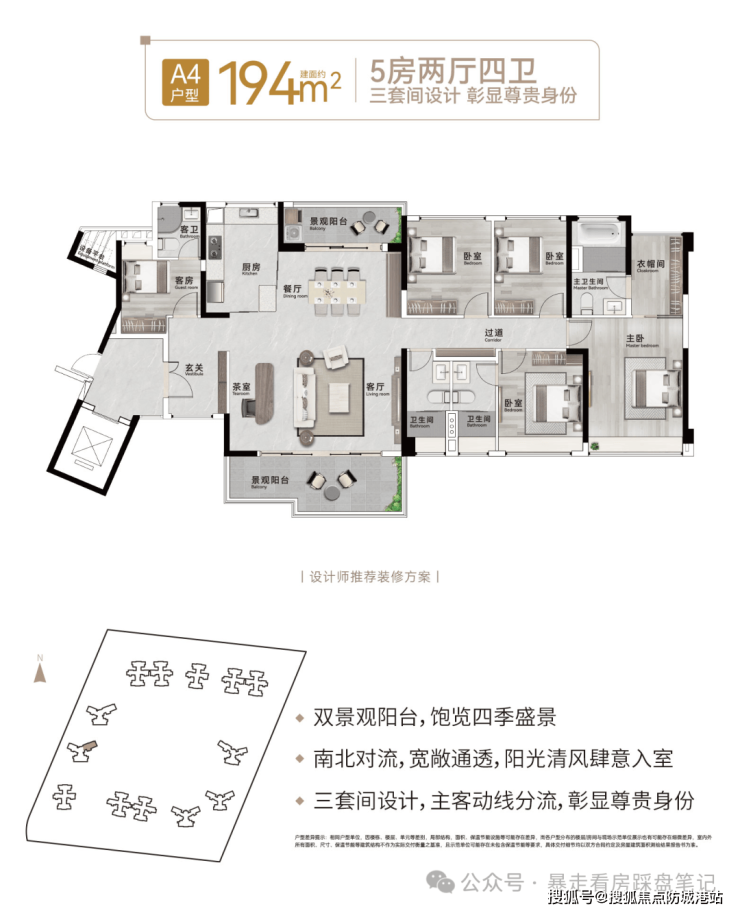 建面约 194㎡5 房 2 厅 4 卫户型:藏品级奢阔大平层,仅 27 席稀缺供应,专梯入户保障私密尊崇,双景观阳台实现南北对流,约 21 米南向开间全明采光,双向景观视野,全屋 3 个套间设计,适配高端置业需求。