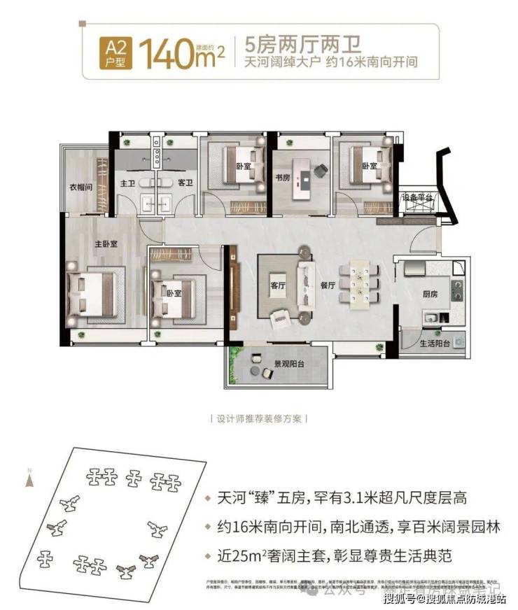 建面约 140㎡5 房 2 厅 2 卫户型:两梯四户臻五房设计,适配家族聚居需求,南北对流格局,约 32㎡阔绰客餐厅,约 16 米南向五开间直面央景园林,约 25㎡豪华主卧配阳光衣帽间,满足多代同堂居住需求。