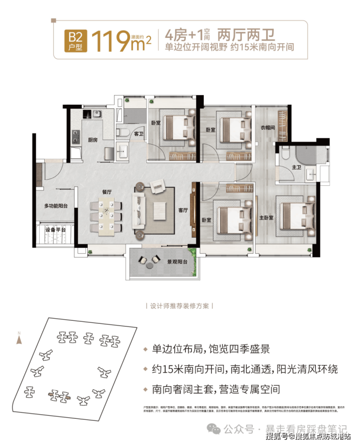 建面约 119㎡4 房 + 1 空间 2 厅 2 卫户型:分横厅与竖厅两款,为改善换房首选,横厅款约 15 米南向五开间,南北通透;竖厅款约 3.1 米层高、双阳台设计,两款均配备南向奢阔主卧套房,+1 空间实现多功能使用。