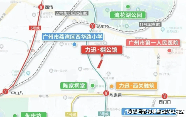 力迅樾公馆所处的位置,是广州老城区中少有的“黄金三角”——东接越秀(直线距离仅1公里),西临荔湾湖,北靠中山七路,南望上下九步行街。项目500米范围内即享双地铁覆盖:陈家祠站(1号线/8号线)与彩虹桥站(8号线/11号线/13号线/22号线)。其中,彩虹桥站作为广州地铁“超级换乘枢纽”,未来将实现四线交汇,11号线作为环线贯通天河、海珠、白云、荔湾四大核心区,13号线二期直达珠江新城,极大提升了项目通达全城的效率。从项目步行至任一地铁站仅需约6分钟,真正实现“地铁上盖”级便利。
