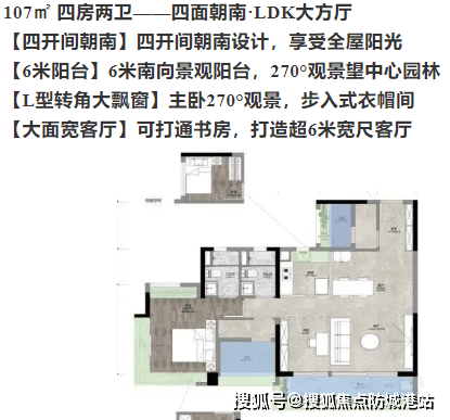 107㎡四房两卫:四开间朝南,6米南向景观阳台,L型转角大飘窗,可打通书房打造超宽尺客厅。