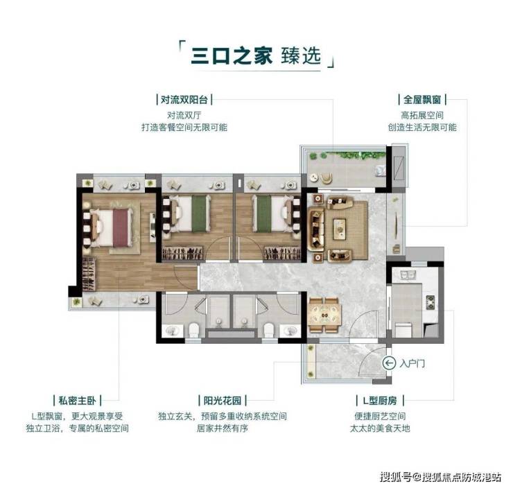 项目主打76-107平方米的三到四房户型,所有户型均采用精装修标准,得房率高达92%,且赠送面积较大,使得这些户型在市场上具有很高的竞争力。特别是蝶式布局加上台地资源优势,不仅增加了采光和通风效果,还保护了住户的隐私。【建面约75㎡单边对流三房两厅一卫】