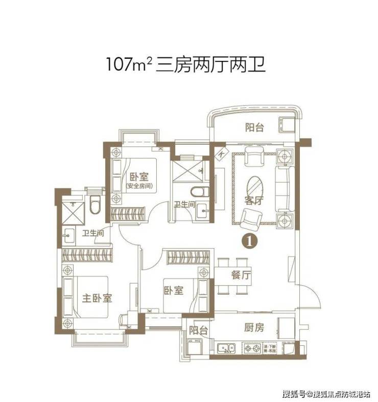 建筑面积约107㎡的三房两厅两卫