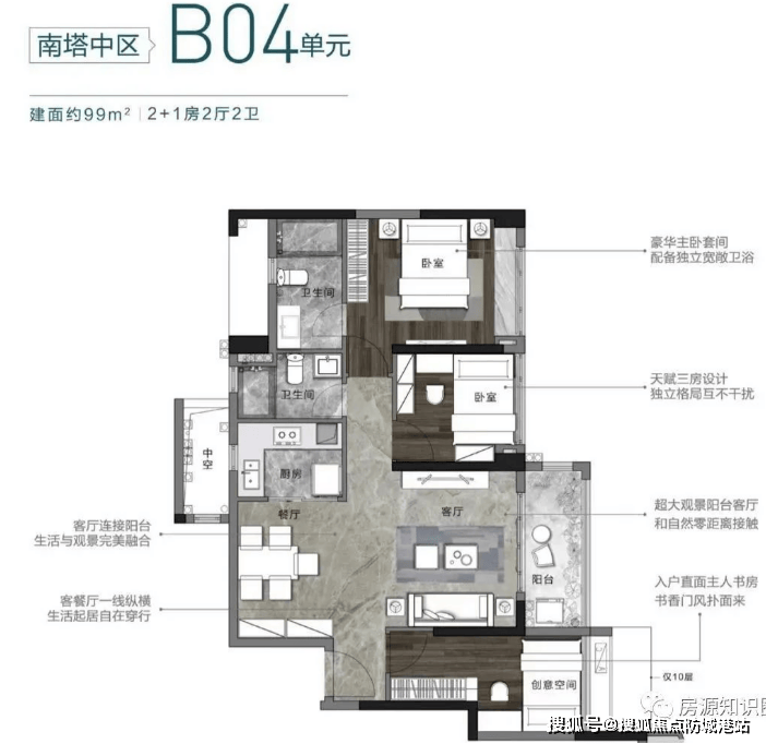 101㎡户型:超大餐客厅联通南向阳台,设计收纳空间充足,干湿分离卫浴体现现代居住理念。