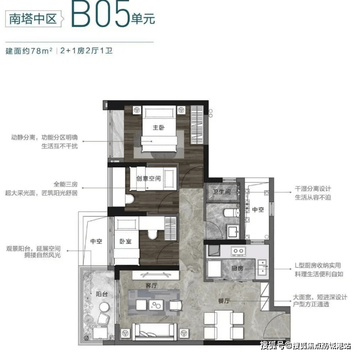 65-97㎡两至三房:横厅设计,动静分区明确,采光良好,适合小家庭及投资自住。