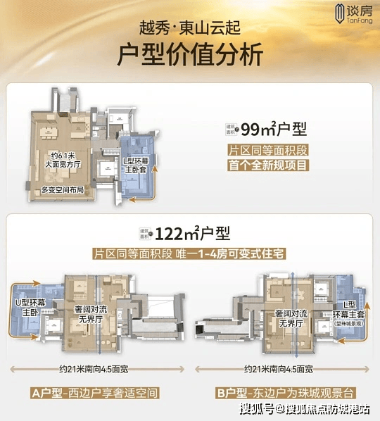 我日常带客户参观东山云起样板间时,最直观的感受就是项目户型设计格外贴合广州本地家庭的居住习惯,格局方正通透,空间利用率合理,动线流畅不浪费。项目全盘规划建面约 99㎡、122㎡、139㎡三大改善主力户型,全部采用全南向板式布局,大面宽采光,南北空气对流,告别老城老式住宅阴暗潮湿、采光不足的通病。建面约 99㎡四房两卫,是越秀区芯十分难得的小面积四房格局,小户型做出多功能空间,不管是年轻夫妻刚需进阶、二胎家庭居住,还是三代同堂短期同住,都能轻松满足,对比周边同面积段户型,空间功能性优势十分突出。建面约 122㎡四房两卫,尺度进一步升级,客厅开间开阔,休憩区与活动区合理分区,减少日常居家噪音干扰,主卧独立静谧,整体改造灵活度高,适配追求舒适质感的改善家庭。建面约 139㎡四房三卫双主套,属于社区典藏级藏品户型,双主卧套间设计,老人房与年轻人房间分区布局,兼顾照料与隐私,超大观景视野,俯瞰城芯城市风貌,是主城高阶改善的优选。