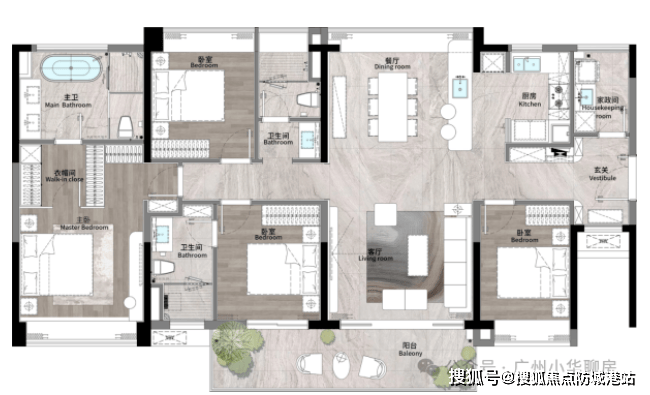 建面约140㎡横向四房:约7.7米跑道式阳台,媲美200㎡大平层尺度;三面采光主卧套房,配置独立卫浴、衣帽间与观景飘窗,私享五星级起居体验。