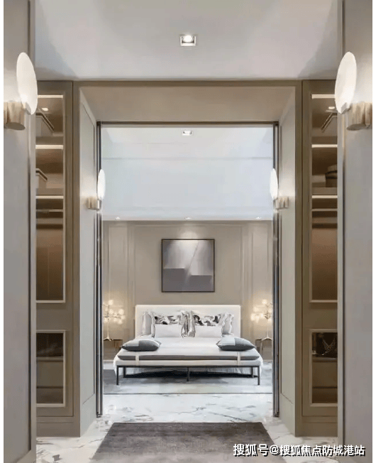 主卧设计极具仪式感与奢适感,采用严格对称布局,彰显庄重优雅。入户廊道两侧配备超大步入式衣帽间,廊道铺设星光红毯,延伸至睡眠区,营造出法国爱情大片般的梦幻场景。睡眠区预留充足“留白”空间,两侧搭配落地玻璃窗与简洁平整天花,光线进入后让室内空间向外无限延伸,搭配意大利进口B&B husk和B&B Tabano扶手椅,兼具舒适感与艺术气息,无论是休憩还是品酒会友,都能享受极致惬意。