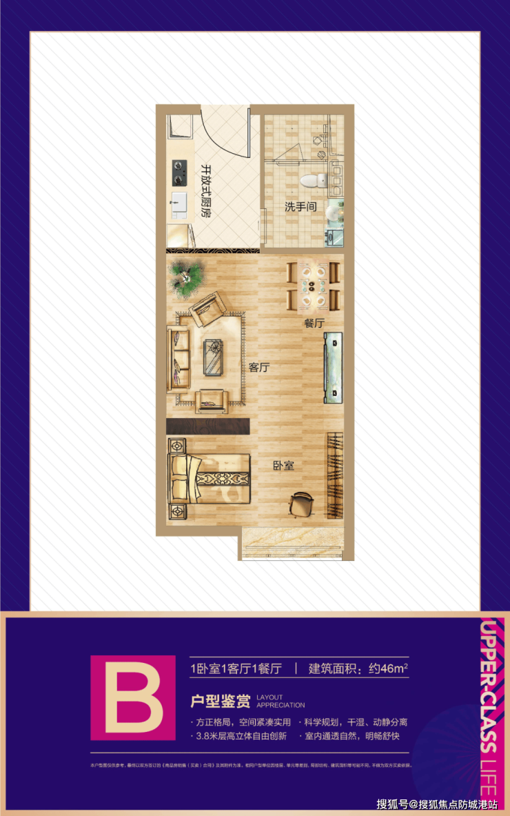 建面约46㎡ 1房1厅1卫:总价约115万元起,复式设计,使用率超180%,南北通透,全明格局
