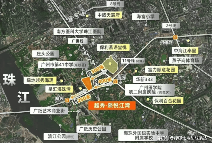 熙悦江湾背靠越秀·星汇海珠湾这一成熟的大型社区,享受其丰富的配套设施。项目距离广佛线燕岗站约400米,广州地铁11号线棣园站约250米,地理位置优越,交通便捷。特别是即将开通的地铁11号线,将连接琶洲、天河等区域,极大提升了出行便利性。