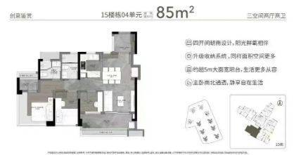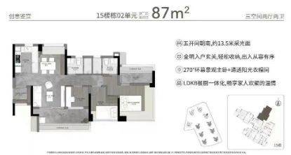 88㎡ 3空间2厅2卫:四面宽小户型设计,三卧室朝南,超11米景观线,精细化收纳墙达约24000升。