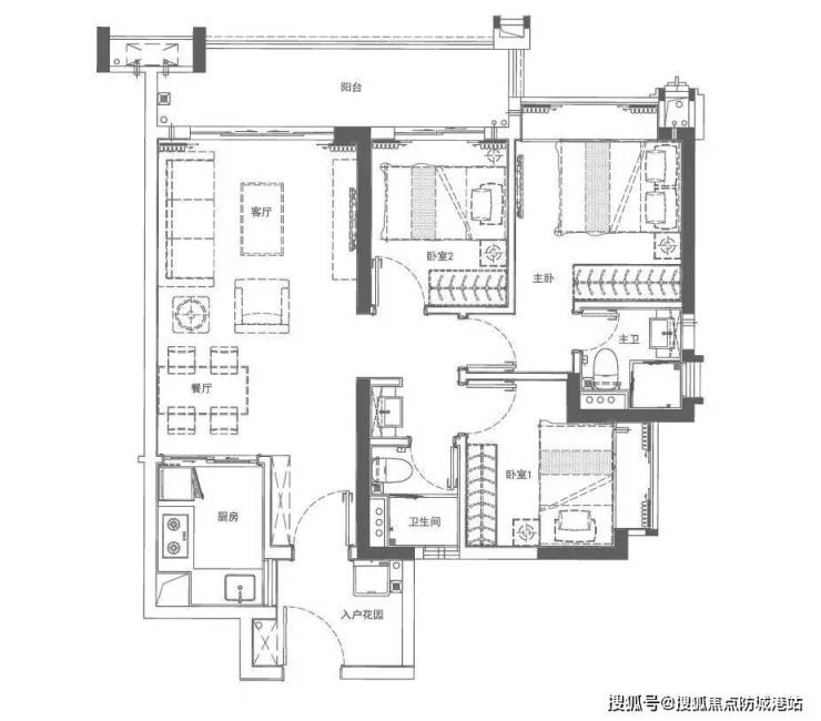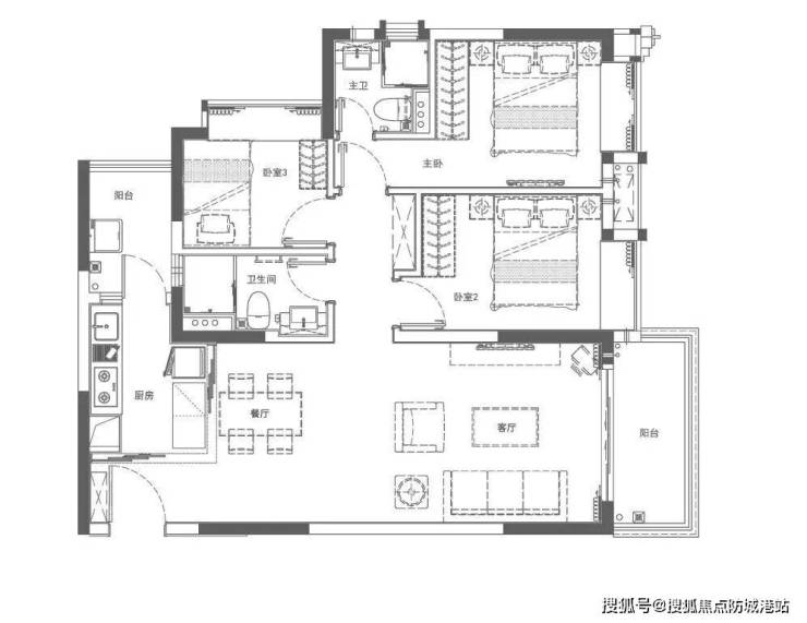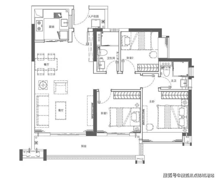 86㎡三房(南北通透/水景版):一户南北对流,一户直面灵动水景,布局灵活;
