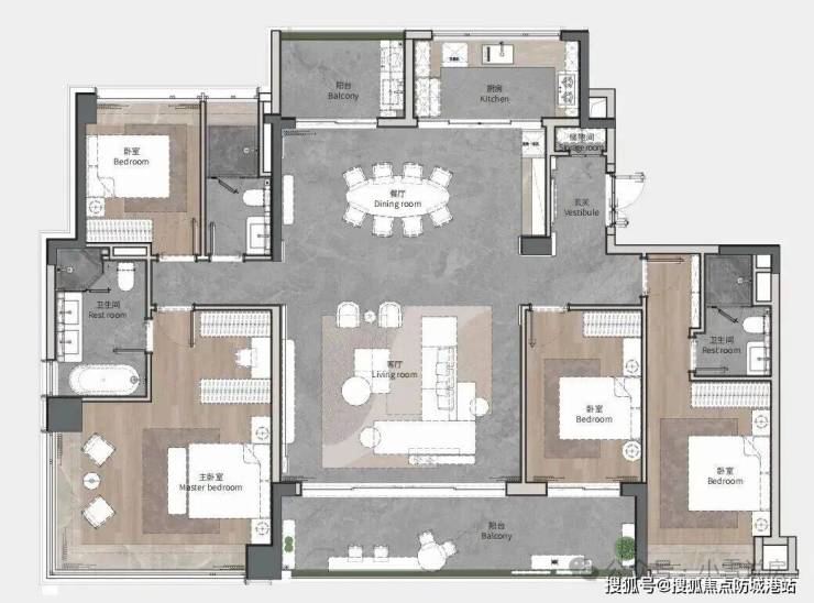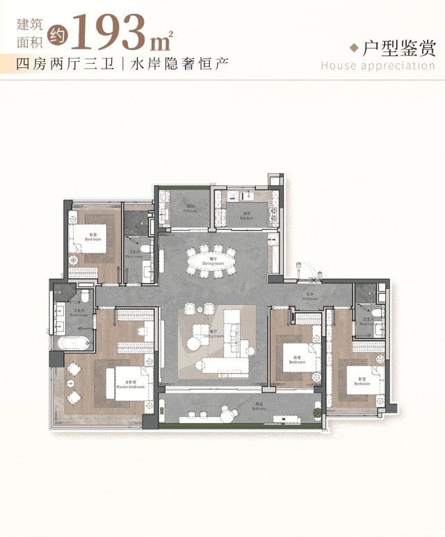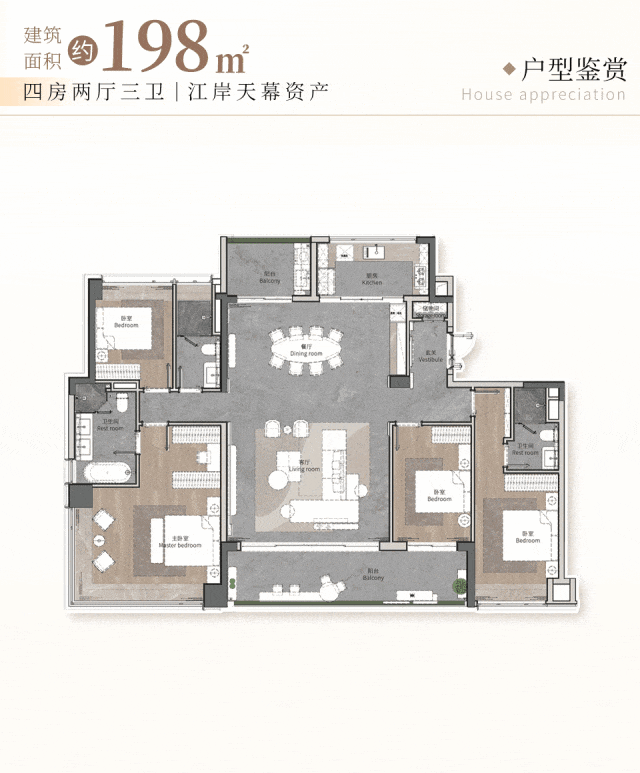 这些大平层均占据一线江景最佳观景位,采用T2梯户比设计,实现私梯入户,保障归家私密与尊崇感。内部规划双独立套房,满足多代同堂或主客分居的高端需求;中西双厨配置,兼顾中式爆炒与西式烘焙的生活仪式感;超大尺度豪华会客厅,可轻松容纳社交宴请或家庭聚会,彰显主人格调。