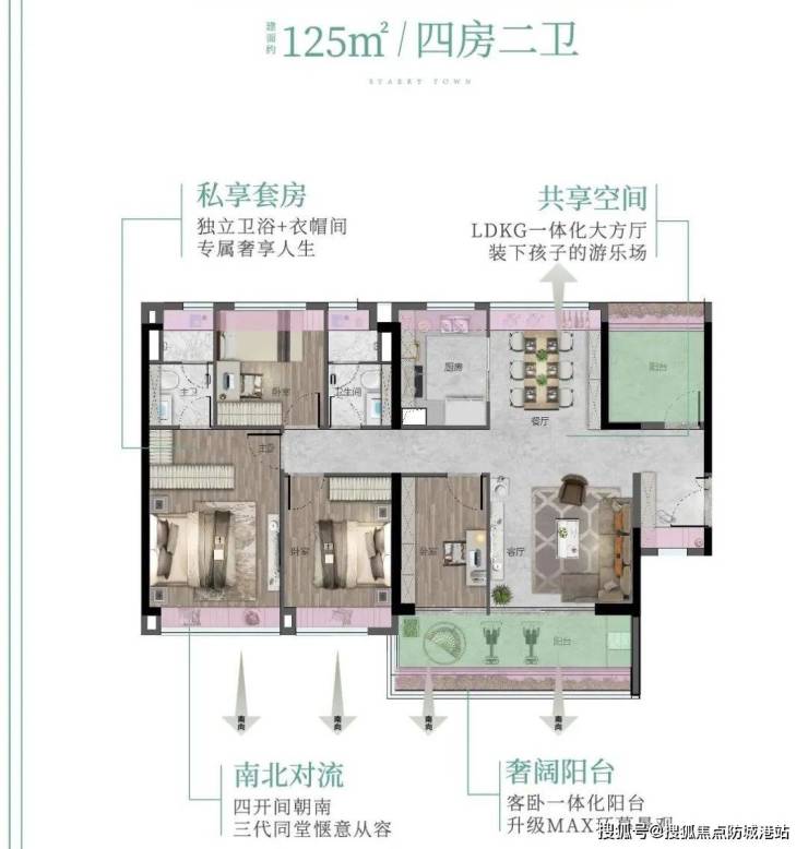 125㎡四加一房两卫:五开间朝南,客餐厅主卧南北对流,LDKG大方厅设计,空间利用率高。