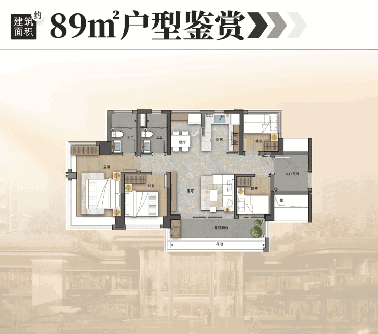 建面约87平米五空间:采用LDKB一体化设计,总价不到250万。