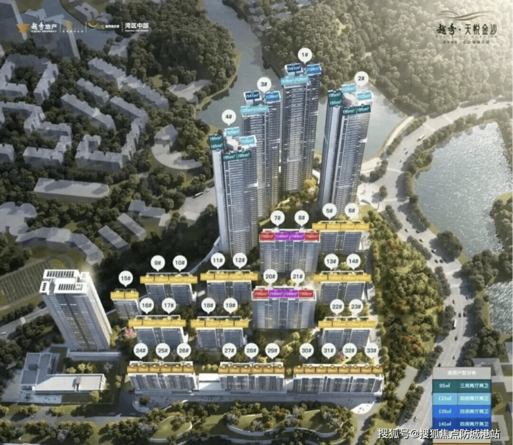 项目规划极具战略前瞻性,总占地面积约10.5万平方米,容积率控制在舒适的2.88,绿化率达35%,总计约1505户,车位比高达1:1.54(总计2741个车位),彻底解决了都市岛居的停车痛点。在建筑设计上,项目采用高低配布局,涵盖建面约95-200㎡的板式小高层与超高层洋房,并创新性地引入了“底叠”产品。这种“国企匠筑、低密纯粹、全龄户型”的开发模式,配合越秀地产作为广州万亿国资的信用背书,为资产的稳健性与进阶价值提供了双重保障。
