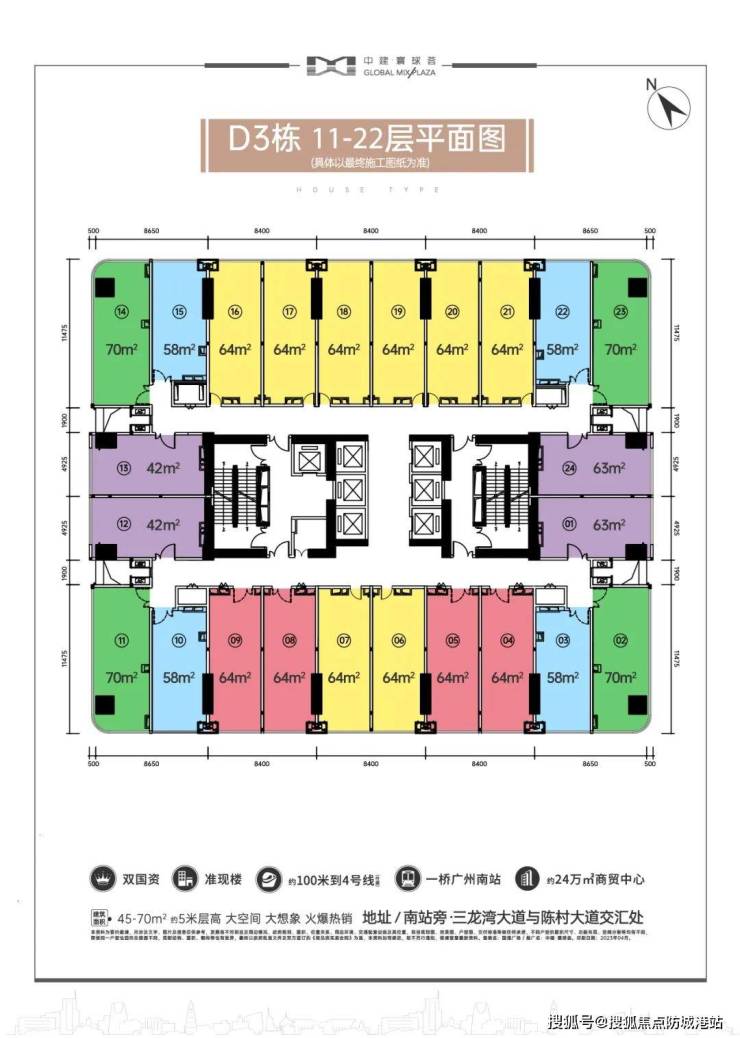 项目产品涵盖45-70方,4.2米开间,稀缺5米层高,真正双钥匙,独立入户不打扰,买一套得两套,实用率高达150%。