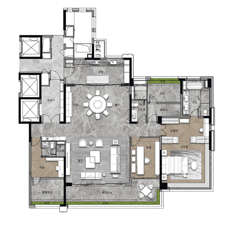 268平米四房两厅四卫:专为追求高品质生活的大家庭设计,LDKG大方厅布局,南北对流,生活空间宽敞明亮。