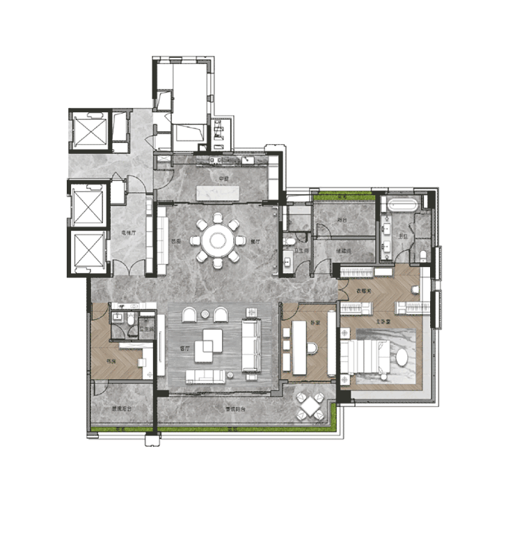 天河保利天瑞提供从107㎡至268㎡不等的多种户型选择,每户均朝南设计,确保充足的自然光线和通风效果。特别是其旗舰户型——268平大面积住宅,采用3梯2户设计,配备保姆电梯,为业主提供了极致的私密性和舒适度。