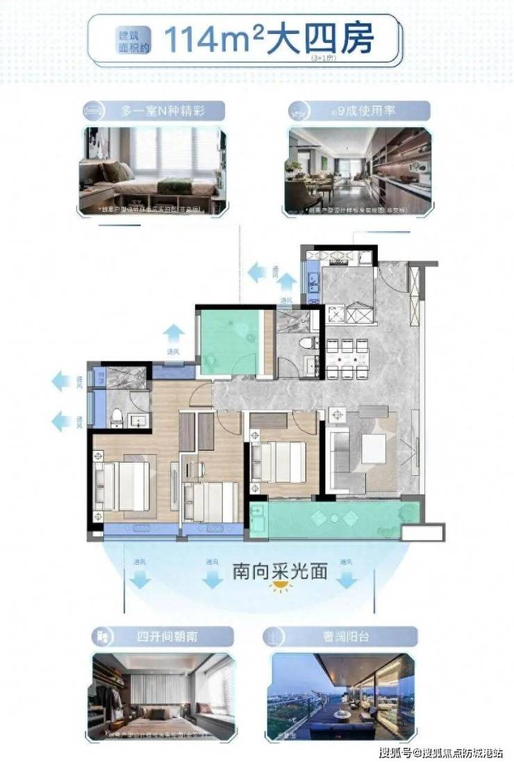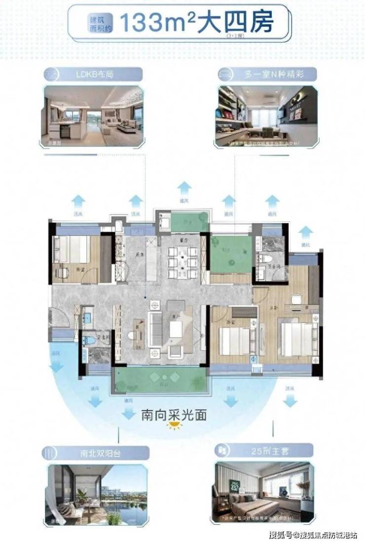 越秀星寰TOD的主力产品集中在92㎡至133㎡区间,均为三至四房设计,强调实用与通透性。以建面约92㎡的“2+1”三房为例,做到四开间朝南,主卧、次卧、客厅甚至多功能房都能享受自然采光,且南北对流,夏季穿堂风顺畅。而114㎡和133㎡户型则进一步放大公共空间,前者配备约6.5米长阳台,后者采用LDKB(客厅、餐厅、厨房、阳台一体化)布局,适合多代同住或追求开阔感的家庭。