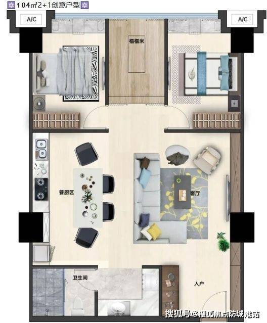 104㎡2+1创意户型:多功能房可作书房、儿童房或衣帽间,满足成长型家庭需求。