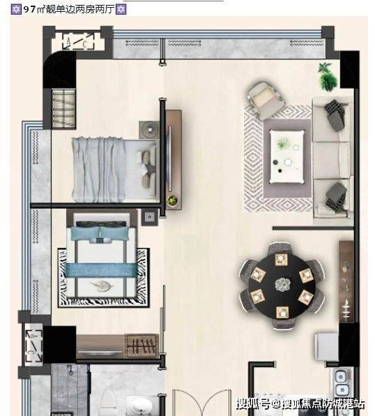 97㎡两房单边户:南北通透,主卧带飘窗,私密性强;
