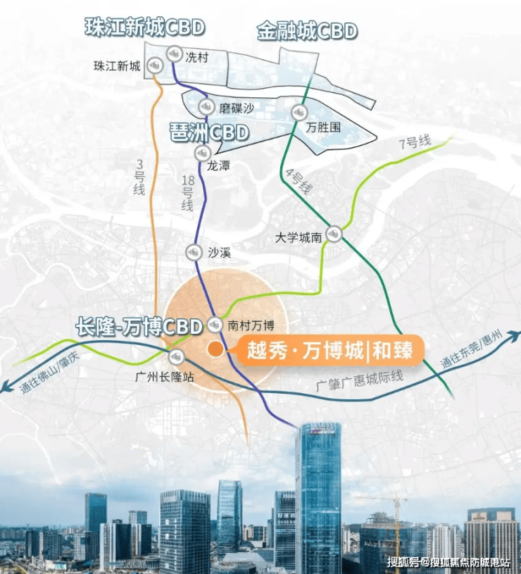 地铁:项目距7号线万博站直线距离800米,18号线南村万博站1.2公里,30分钟直达珠江新城、琶洲、广州南站。