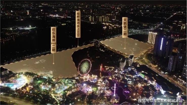 桂畔海水上立交工程已于2024年2月正式动工,8月实现第一阶段南北向通水,预计2025年上半年完工。未来水系、陆地将一体联通,串联顺峰山和欢乐海岸PLUS两大景区,实现“城市双核”梦幻联动。
