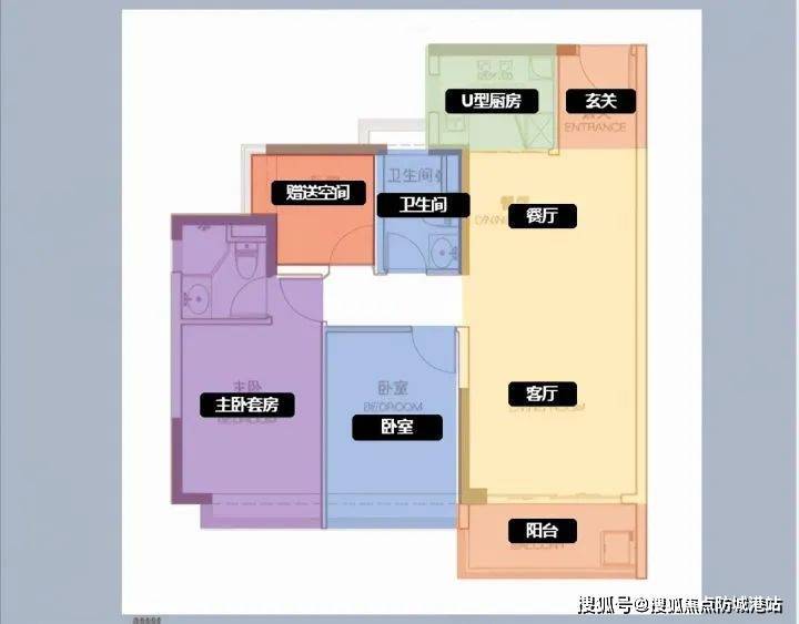 ②玄关-餐厅-客厅-阳台连贯一体式,充足通风采光,动静分区;