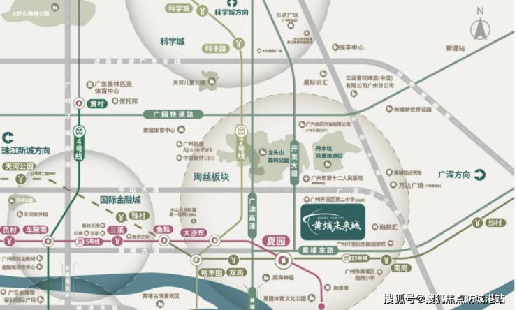 项目位于黄埔区南岗片区,毗邻黄埔东路和开发大道,快速路体系完善,能够实现与广深沿江高速的快速连接,通勤至广州、东莞和深圳核心片区均在一小时生活圈之内。轨道交通方面,南部靠近地铁五号线与十三号线,未来可直接换乘广佛环线,实现与珠三角轨道网络的无缝衔接。该地块虽然地处老黄埔边缘,但交通优势在于公路和轨道的双重覆盖,既能保障工作日快速抵达市区,也能满足业主周末跨城出行的便捷需求。尤其是对于在科学城、知识城等高新园区上班的人群而言,从黄埔未来城出发通勤距离较短,兼具成本与效率优势,因此该盘在改善市场上拥有一定的吸引力。