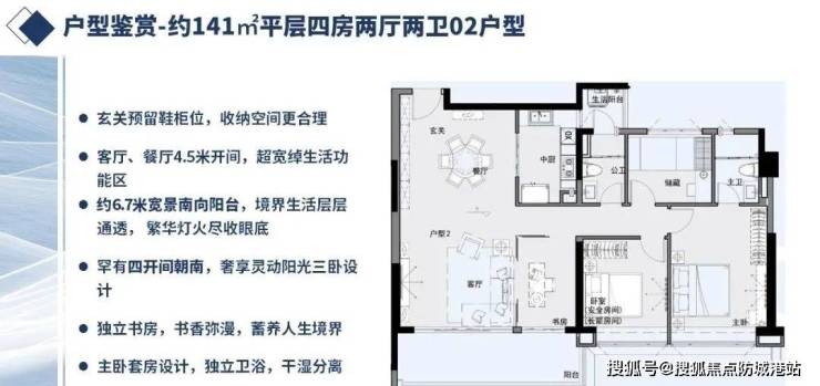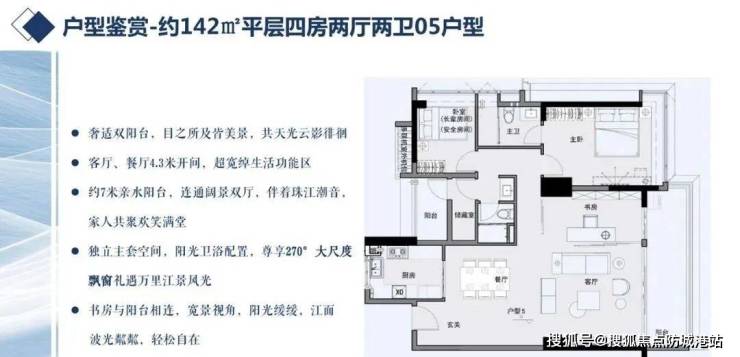 建面约139-142m²四房两卫:市区稀有的约3.15米层高,6-7米双联阳台,动静分区,其中02户型带双阳台,05户型主卧270°飘窗。