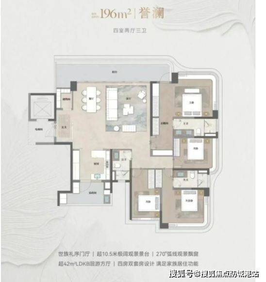 205㎡四室两厅三卫:以 42㎡洄游方厅、10.5 米奢阔观景露台为核心,强化空间通透感,提升居住品质。售楼处电话:4009909752。