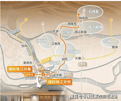 『保利·珠江印象』地处广州市荔湾区东沙,紧邻白鹅潭大道和东沙石岗隧道,距离地铁10号线东沙站仅约700米,步行可达。通过地铁10号线,居民可以快速到达中大、滨江东等地,直达珠江新城也十分便捷。此外,规划中的水上巴士及港湾码头(计划3年内完工)将为居民提供一种全新的出行方式,畅享滨水生活。自驾方面,项目附近有多个出入口,如环城高速、东新高速等主要道路,进一步提升了出行便利性。