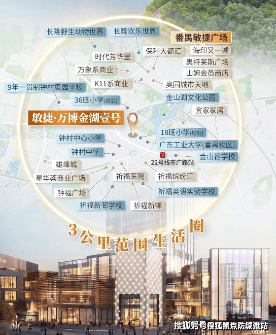 敏捷金湖壹号坐落于广州市番禺区市广路与金山大道交汇处,地处万博CBD核心区与金山湖文化公园生态带交汇点,是敏捷集团深耕广州30年的“壹号系”标杆作品。项目总占地面积约7.45万平方米,总建筑面积约23.98万平方米,规划15栋高层住宅(27-32层),涵盖75-148㎡三至四房全南向户型,容积率仅3.21,打造低密湖居典范。