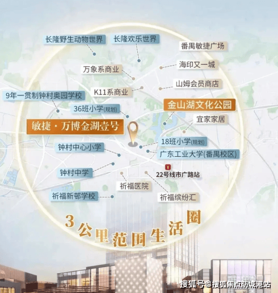 教育方面,项目自带12班幼儿园,东侧地块已规划36班九年一贯制学校,有望形成12年一站式教育闭环。周边更有钟村奥园学校、省一级钟村中心小学及中学等优质资源,叠加毗邻广东工业大学番禺校区的地缘优势,未来办学质量与生源结构具备高起点潜力。商业配套极为成熟,斜对面即祈福缤纷汇,1公里内覆盖宜家家居、万达广场、天河城、四海城,K11亦即将开业,高端消费触手可及。医疗资源虽未列明具体名称,但万博作为成熟CBD,三甲医院及社区医疗体系完善,健康保障无忧。而紧邻的金山湖文化公园,不仅提供日常散步、骑行、亲水空间,更赋予项目独特的生态文旅价值,堪称番禺版“香蜜湖”。