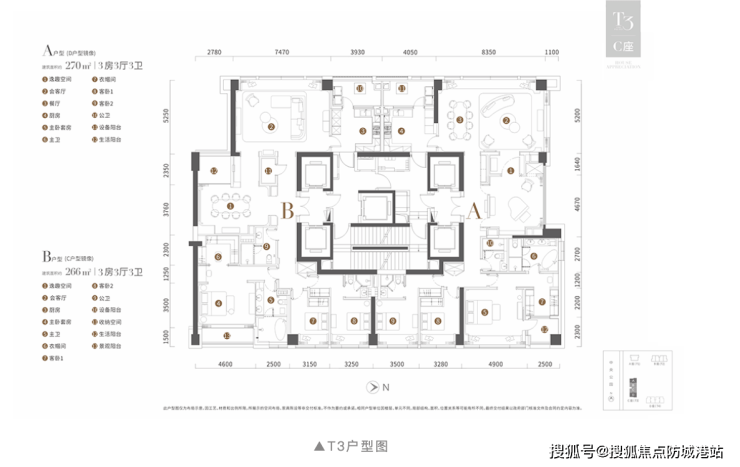 中心天元产品主要集中于高区大平层及行政级公寓,两大主力户型分别为T3栋266至270平三房和T4栋314至330平四房产品,专为多代家庭或高净值人群定制,提供私密性与舒适性兼备的居住体验。
