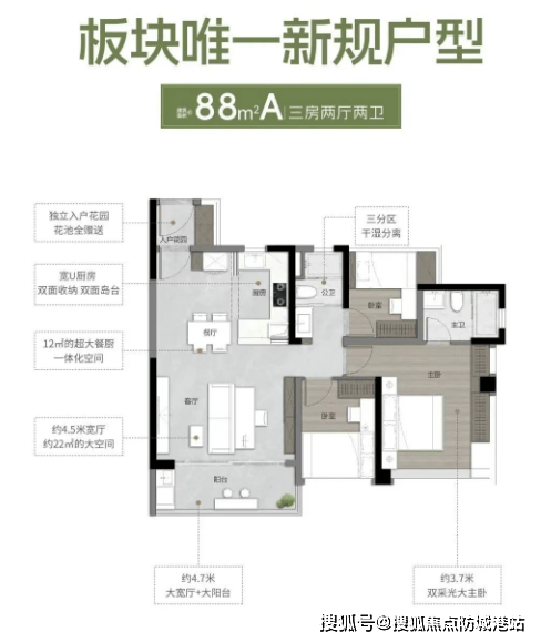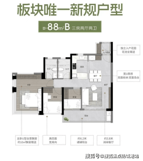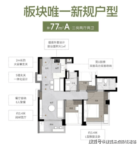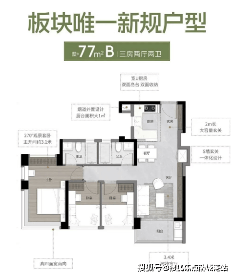 77㎡三房两卫:三面宽朝南,LDKB一体化公区,270°全景主卧;