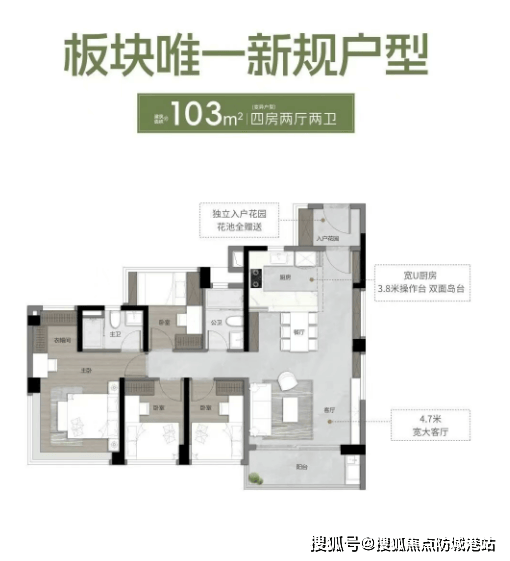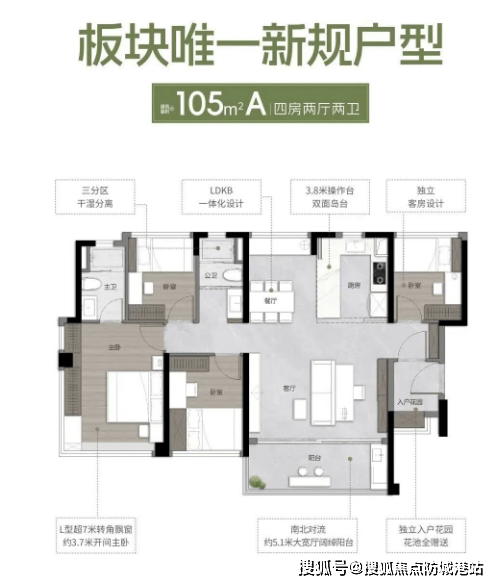 103–105㎡四房:独立入户花园,270°转角飘窗,LDKB+X空间灵活布局;