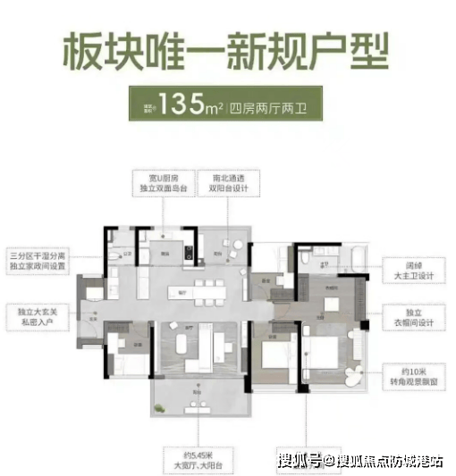 135㎡四房:南北双阳台,5.25米大宽厅,主卧开间近3.6米,尺度媲美改善产品。