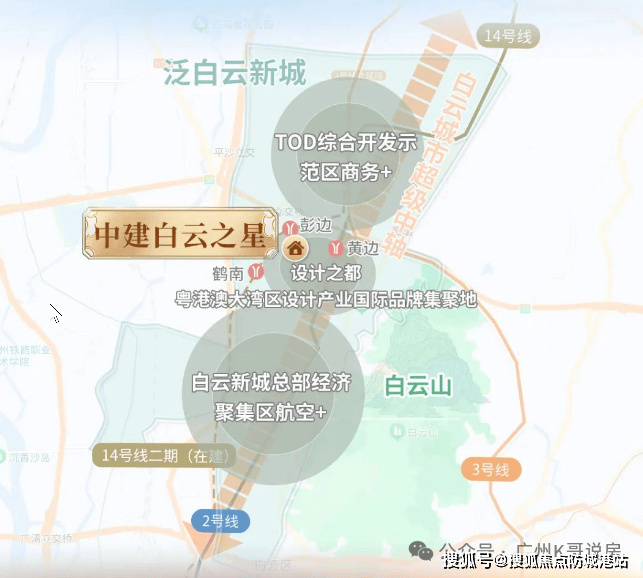 中建・白云之星落址于广州白云区城市发展主轴核心,地处广州设计之都板块核心位置,是白云区重点打造的城市更新标杆项目,也是中建之星高端产品系落地大湾区的首个标杆作品。白云区作为广州面积最大、人口最多的中心城区,以白云新城、设计之都、嘉禾望岗 TOD 三大板块串联形成城市发展主轴,项目正处于主轴核心节点,向南串联白云新城总部经济集聚区,向北联通嘉禾望岗 TOD 综合开发示范区,向西连接白云湖数字科技城,是白云城市发展的核心枢纽。广州设计之都定位为粤港澳大湾区设计产业国际品牌集聚地,自 2019 年动工以来,已建成 39 栋现代化产业载体,建成优质产业载体超 86 万平方米,截至 2024 年底,园区年产值从改造前的 5000 万元增长至 800 亿元,累计吸引超 400 家优质企业进驻,其中包含 63 家国家、省、市专精特新企业,111 家高新技术企业,集聚设计创新专业人才超 10000 人,已成为全国规模最大的设计产业集群,为项目提供了坚实的产业支撑与高端居住需求基础。