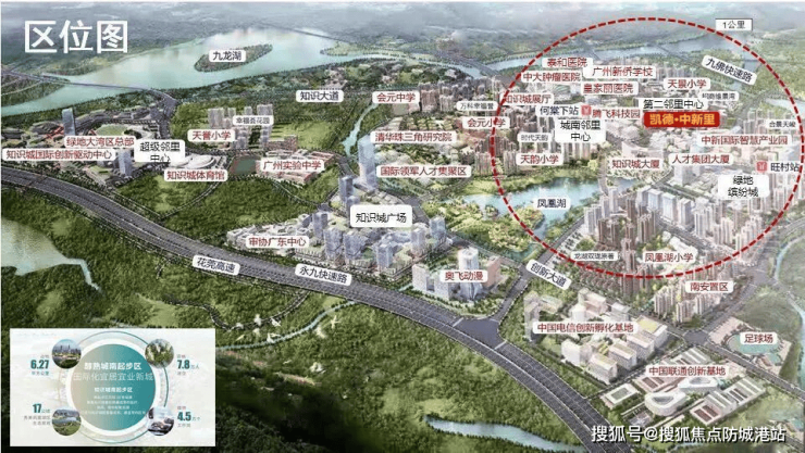 凯德中新里周边教育资源丰富,1.5 公里范围内已开学的学校有 3 所,包括广州新侨学校、天景小学、凤凰湖小学,直线 3km 范围内还有多所幼儿园、小学和中学,如广州市黄埔区天韵小学、广州市黄埔区会元学校、汤村小学旺村分校、广州实验中学、华南师范大学附属中学(知识城校区)等。其中,华附中学(知识城校区)为省公办重点中学,预计 2025 年正式开学,办学规模为 36 个班,提供 1800 个学位,将为区域内学生提供优质的初中、高中教育资源。