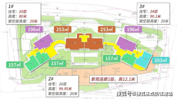 首推精装洋房1号楼,2梯3户结构,层高约3.15m,提供157㎡、196㎡、253㎡四房格局,空间尺度宽阔。