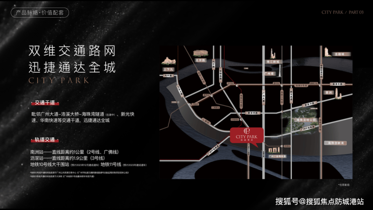 中国铁建・西派粤府交通网络逐步完善,未来可畅达大湾区。公共交通方面,距离 3 号线沥滘地铁站约 1.7 公里,2 号线南洲地铁站约 2 公里,可通过便民车或电动车接驳。自驾方面,沿沥滘路可接驳广州大道、新光快速,20 分钟左右车程可达琶洲、万博、珠江新城、金融城等核心区域,30 分钟可覆盖大半个广州。周边有洛溪大桥、环城高速等干道,通过这些交通枢纽可便捷接入大湾区交通体系,畅达佛山、深圳等城市。虽然目前公共交通有一定距离,但自驾便利,随着区域发展,交通配套将进一步优化,提升项目的通达性。